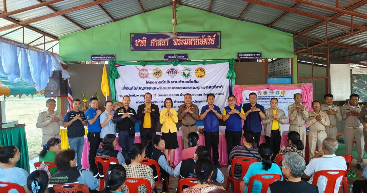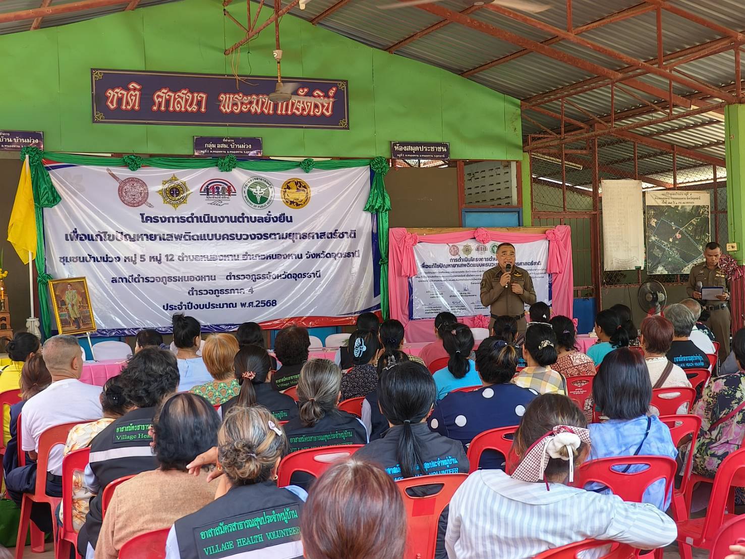 โครงการตำบลยั่งยืน 2568 03/16/2568 โดย admin / ข่าวประชาสัมพันธ์,ข่าวกิจกรรม,ข่าวประชาสัมพันธ์,ไม่มีหมวดหมู่ สภ.หนองหาน วันที่ 14 มี.ค.68 เวลา 14.00น. - นายธนชาต บริสุทธิ์ นายอำเภอหนองหาน - พ.ต.อ.เชี่ยวชาญ มีชัย ผกก.สภ.หนองหาน - นางบัวเงิน รอดขันเมือง นายก.อบต.หนองหาน - นายแพทย์ธงภักดิ์ มีเพียร ผอ.รพ.หนองหาน - นายสานิตย์ เหง้าพรหมมินทร์ สาธารณสุข อ.หนองหาน - น.ส.ขวัญเรือน อู่รัศมี ผอ.รร.บ้านม่วงประชาบำรุง - นายพันนา ทับละคร กำนัน ต.หนองหาน - นายดุลพันธ์ นากลาง ผญบ.ม.5 - นายนิพนธ์ พึ่งคำนวน ผญบ.ม.12 - พ.ต.ท.ศิระ ภูมิสถาน รอง ผกก.ป.ฯ - พ.ต.ท.พรพิทักษ์ ลุนชัยภา สวป.ฯ - พ.ต.ท.ฉลอง ยอดสง่า สวป.ชส.ฯ - พ.ต.ต.วงศ์วริศ ธรรมโกลัง สว.สส.ฯ พร้อมชุด ชมส./ชุดสืบสวน สภ.หนองหาน พร้อมทั้ง ผู้ช่วยผู้ใหญ่บ้าน (อสม) อปพร. ร่วมพิธีเปิดงานโครงการตำบลยั่งยืนเพื่อแก้ปัญหายาเสพติดแบบครบวงจร ตามยุทธศาสตร์ชาติ ณ ศาลาประชาคม บ.ม่วง ม.5 ต.หนองหาน อ.หนองหาน จ.อุดรธานี Previous Next Facebook iconFacebookTwitter iconTwitterLINE iconLine